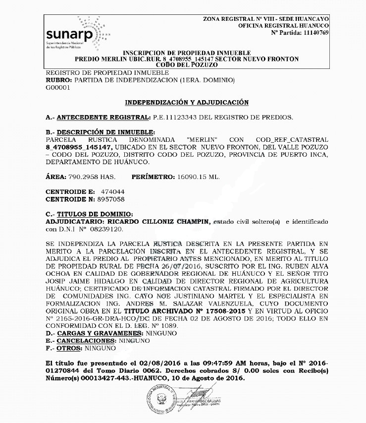 Cillóniz y sus vecinos se convirtieron en dueños de estas tierras en el marco de la campaña de titulación masiva que impulsó el Gobierno Regional de Huánuco. Dicha entidad aprobó la Resolución Directoral N° 0360-2014 para adjudicarse terrenos supuestamente libres y los inscribió en Registros Públicos. Luego, los dividió a favor de 13 personas: madereros, ganaderos y el mencionado empresario. Para concretar este trámite, ellos debieron demostrar que ocupaban estas tierras, pero en los archivos de Puerto Inca no hay información al respecto.